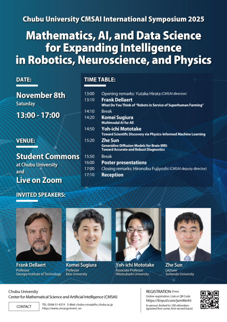 講演会名称:Chubu University CMSAI International Symposium 2025 開催日時:2025年11月8日(土)13:00~ 講演会場:中部大学 スチューデント・コモンズ(不言実行館2階) 対面およびZoom(300名まで) 事前登録URL: https://tinyurl.com/jxm46nht